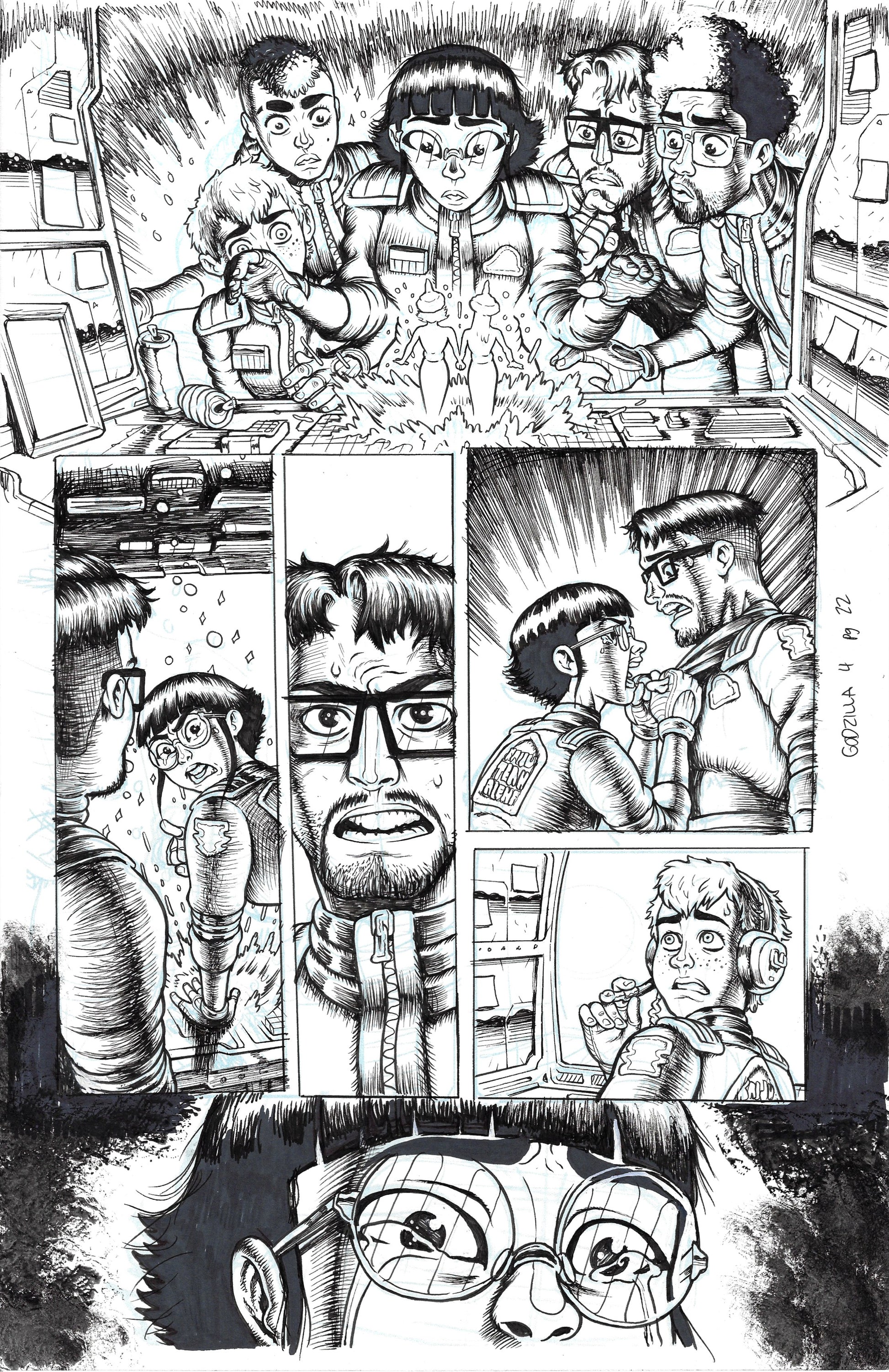 Pencil and ink over digital layouts on approx 11x17 inch paper.